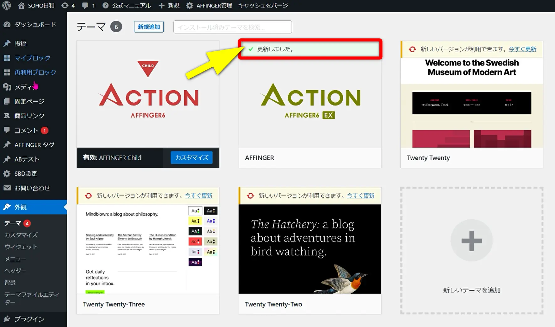 ワードプレスの画面からテーマを更新します。